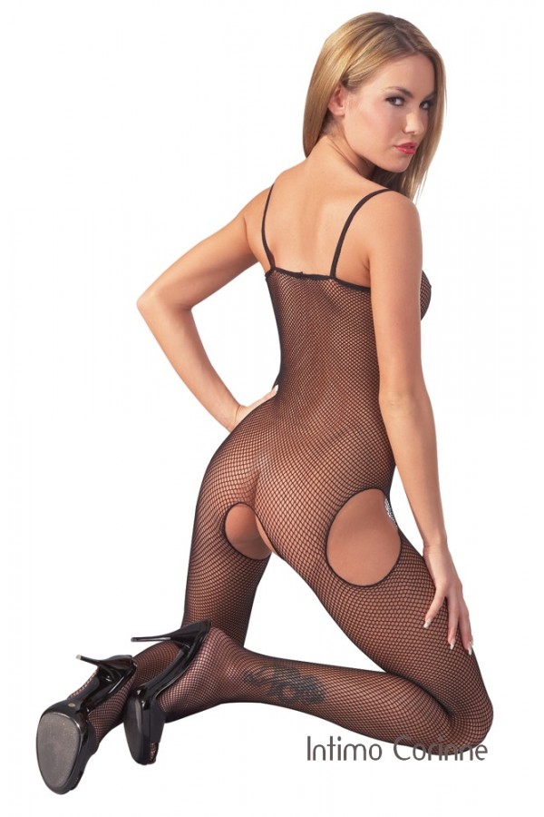Catsuit a rete elasticizzata nera. Aperto all’inguine e sui lati. Bretelle sottili. Con piede.