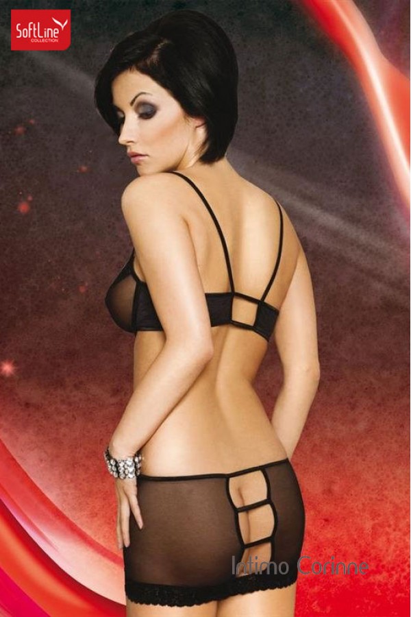 Sensuale completo intimo 2 pezzi nero in tulle e Lycra elasticizzati abbellito con rifiniture in pizzo floreale. Comprende reggiseno munito di ferretto con apertura frontale e minigonna caratterizzata da aperture laterali e nella parte posteriore.