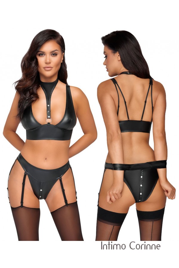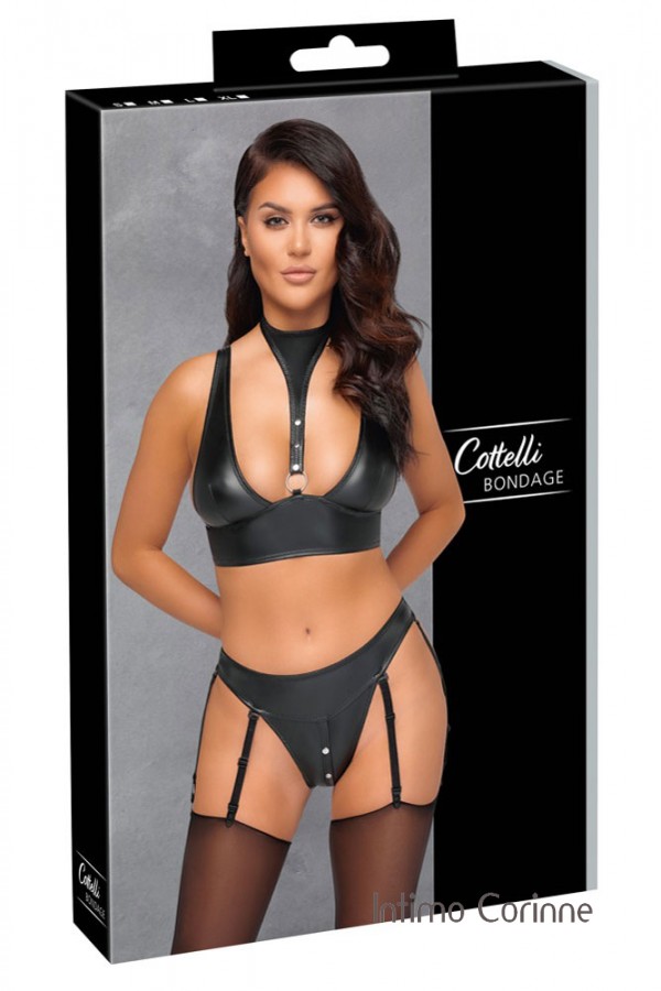 Bralette e mutandine con reggicalze in un intrigante set della collezione "Cottelli BONDAGE" realizzato con un esclusivo tessuto nero opaco, effetto similpelle, con dettagli argentati. Bralette con profondo décolleté, anello decorativo e cinturino che si congiunge al colletto con chiusura regolabile mediante bottoni a pressione sul collo. Le bretelle larghe si dividono in 4 cinghie più strette sulla schiena, ciascuna regolabile. Slip a vita alta con chiusura lungo il cavallo tramite bottoni a pressione. Per accattivanti momenti di piacere, una coppia di morbide polsiere sono saldamente cucite nella parte posteriore dello slip. I reggicalze regolabili possono essere rimossi dagli slip.