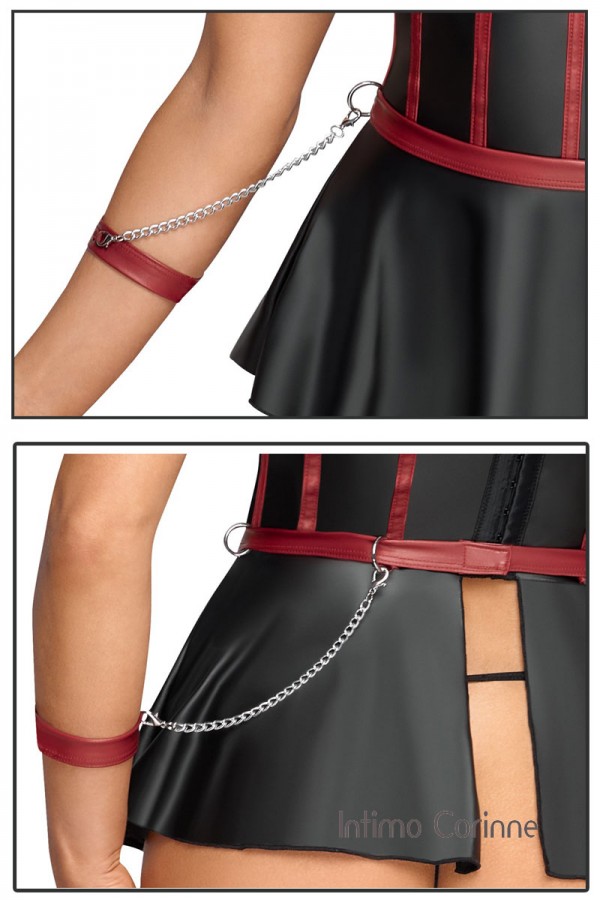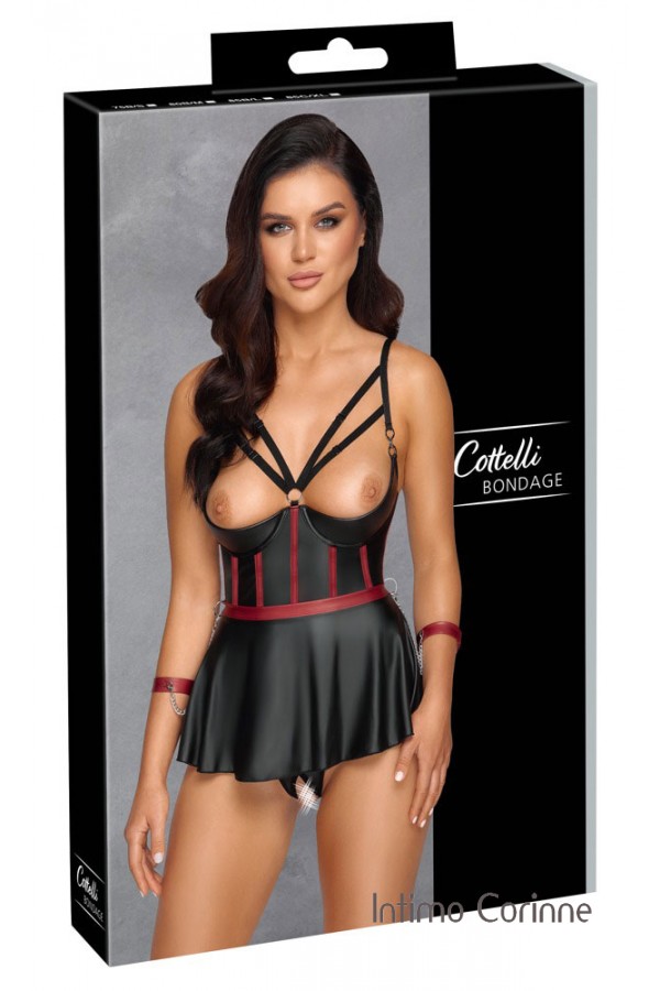 Completo intimo aperto al cavallo dal look distinto ed accattivante della prestigiosa collezione Cottelli Bondage! Top lungo con coppe carioca, morbido ed ondulato nella parte inferiore e perizoma aperto realizzati in un tessuto nero opaco di qualità con strisce rosse a contrasto che sottolineano la vita e dettagli color argento. Le coppe con ferretto leggermente imbottite sollevano perfettamente il seno mentre le balze della gonna svasata, aperta sul retro, coprono delicatamente i fianchi. Le spalline anteriori sono arricchite con motivi decorativi che attirano ulteriormente l'attenzione sul busto. Le spalline, i nastri sullo scollo e la chiusura con gancio sul retro sono regolabili. In vita sono presenti 4 anelli per unire i due polsini con chiusure a strappo, muniti di catena e moschettone. Piccolo perizoma abbinato, aperto al cavallo.