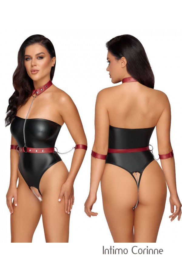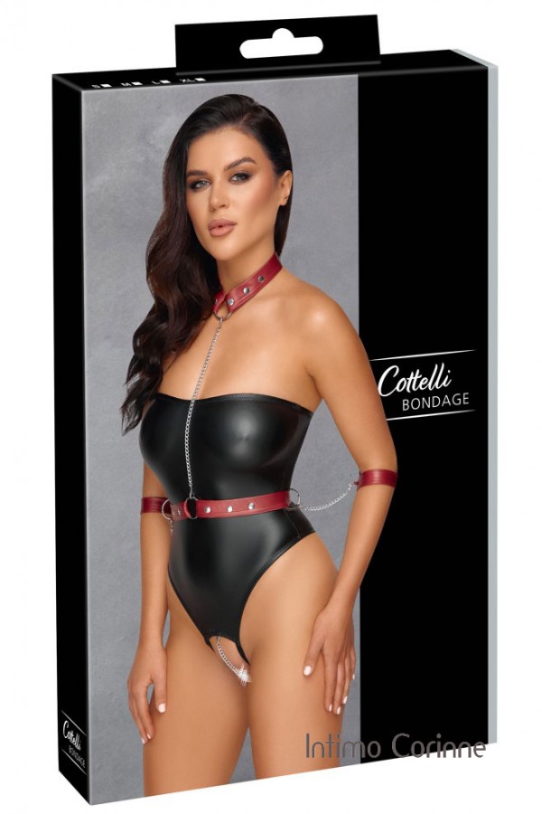 Accattivante body aperto al cavallo, senza spalline, della collezione "Cottelli BONDAGE" realizzato in tessuto nero opaco di alta qualità con imbracatura rossa e dettagli in metallo cromato. Le catene dispongono di moschettoni in modo che collare, cintura in vita e polsini possano essere indossati anche singolarmente. Il collare e la cintura in vita sono regolabili con bottoni a pressione mentre i polsini con chiusura a strappo. La catena stimolante che passa attraverso il cavallo può anche essere rimossa.