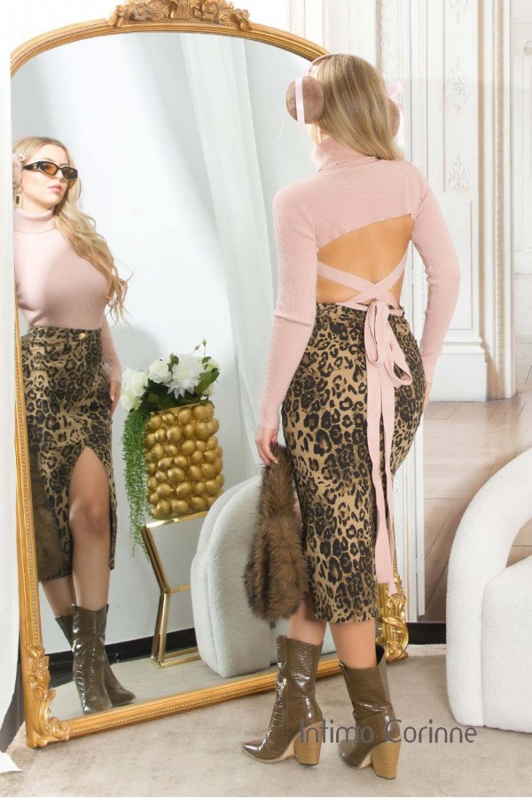 Gonna longuette in morbido tessuto denim leopardato con spacco centrale, tasche anteriori e posteriori. Chiusura frontale con bottone e cerniera dorati.