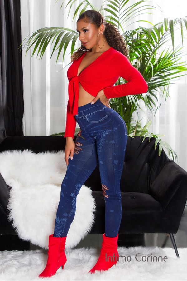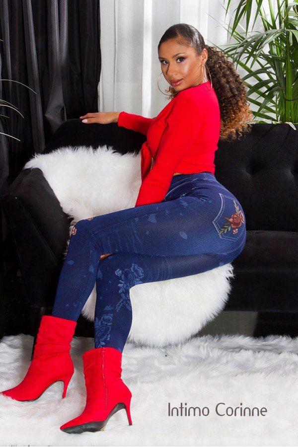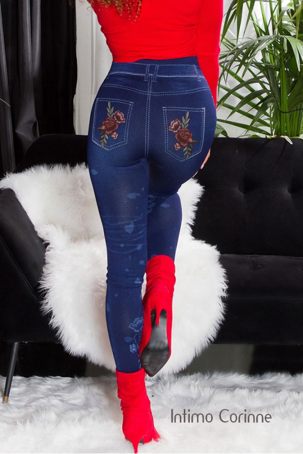Leggings Jeanslook in morbidissimo tessuto blu elasticizzato con trama e disegno effetto jeans arricchiti con ricami floreali. Taglia unica.