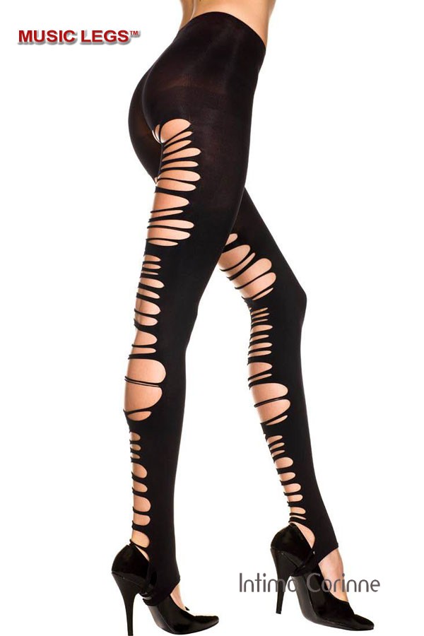 Originale leggings nero in tessuto coprente con tagli irregolari. Possibilità di indossarli con le asolature davanti o dietro.