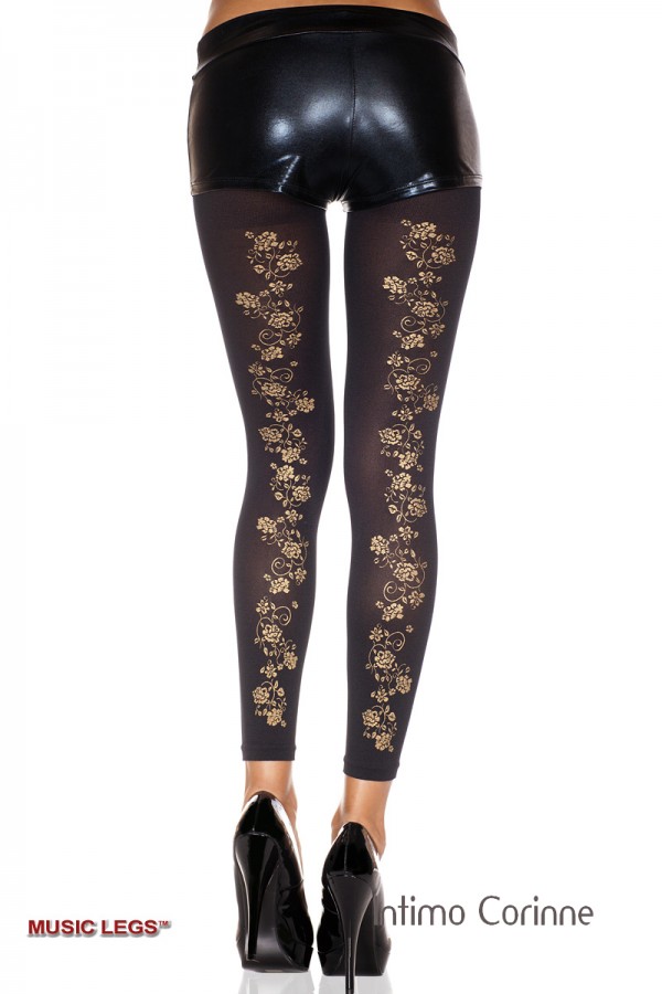 Leggings nero coprente con raffinato ramage posteriore color oro.