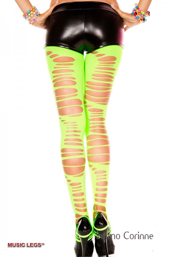 Originale leggings di colore verde neon in tessuto coprente con tagli irregolari nella parte posteriore e possibilità di indossarli al contrario.