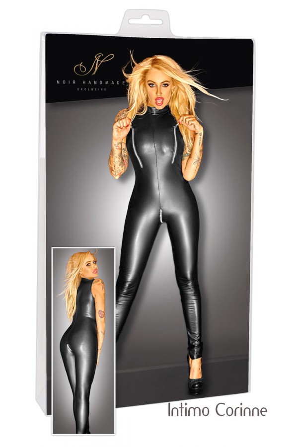 Tuta aderente smanicata caratterizzata da cerniere argentate in corrispondenza del seno e del cavallo. Ulteriore cerniera nascosta lungo la schiena. Tessuto nero semi lucido effetto bagnato, leggermente elasticizzato.
