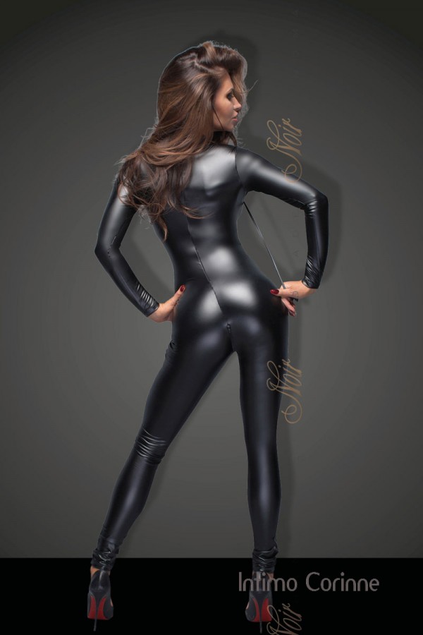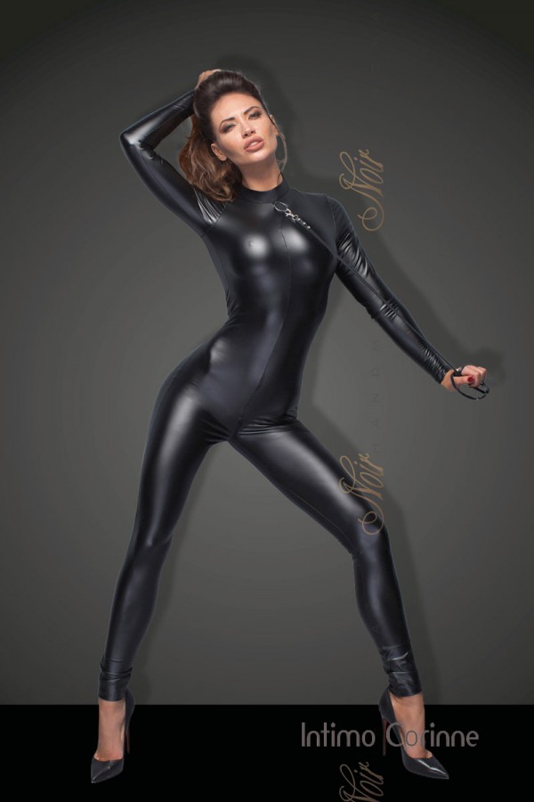 Tuta a maniche lunghe in ottimo tessuto elasticizzato color nero opaco con cerniera a 2 vie in corrispondenza del cavallo e lunga zip sulla schiena. Anello metallico cucito sotto il colletto al quale è possibile collegare il guinzaglio in ecopelle (lungo 90 cm) impreziosito da borchiette con strass.