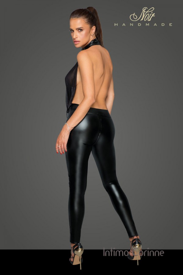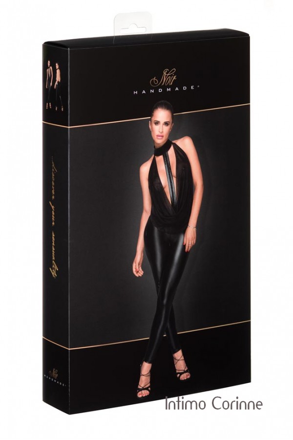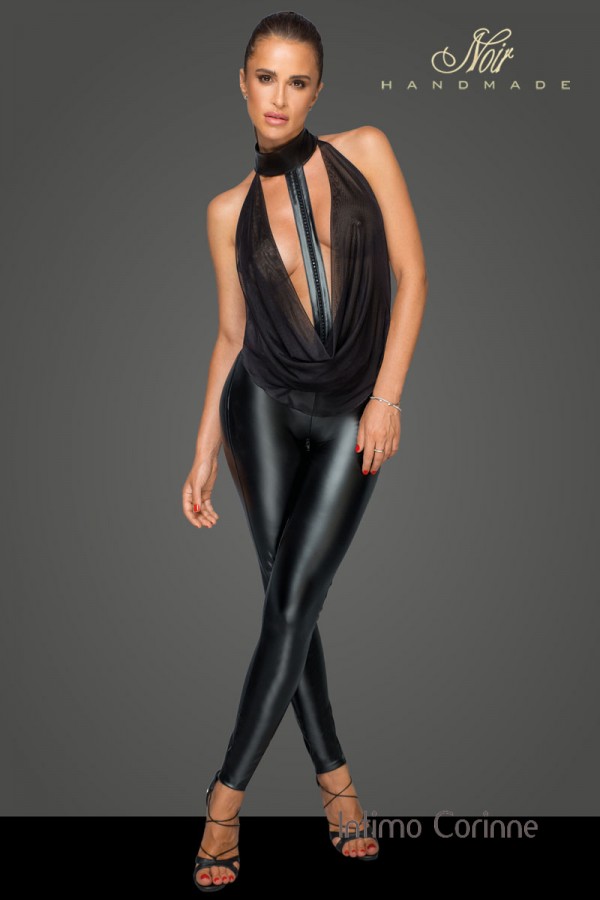 Fantastico completo con la parte inferiore in tessuto effetto bagnato e zip al cavallo unito al top in morbido tulle con girocollo e profonda scollatura a cascata.