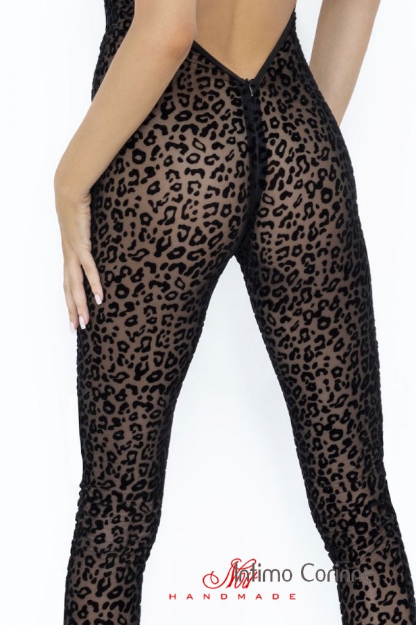 Tuta leopardata in tessuto floccato trasparente. La parte posteriore è completamente aperta e la cerniera a due vie si apre completamente dalla parte anteriore fino a quella posteriore per il massimo comfort.