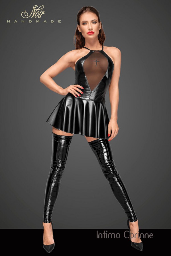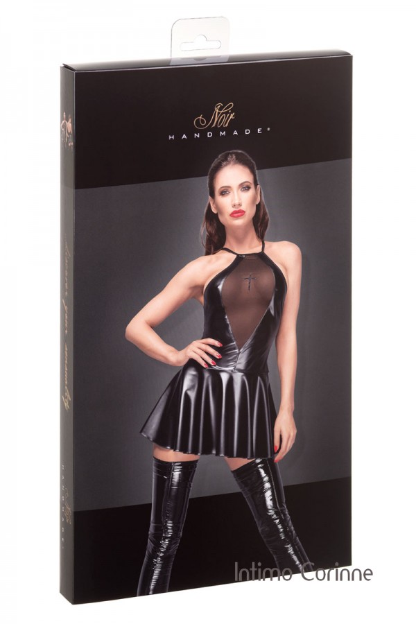 Mini abito svasato in tessuto nero opaco elasticizzato con ampio inserto anteriore in tulle abbellito da una croce ricamata sul décolleté. Cinturini ricamati in pizzo, regolabili in lunghezza ed incrociati sul retro.