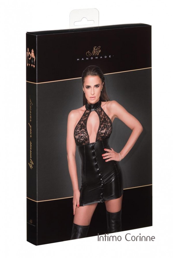 Abito corto realizzato in tessuto effetto bagnato con abbottonatura continua e reggiseno in morbido pizzo. Colletto in tessuto effetto bagnato con comoda chiusura a gancio.