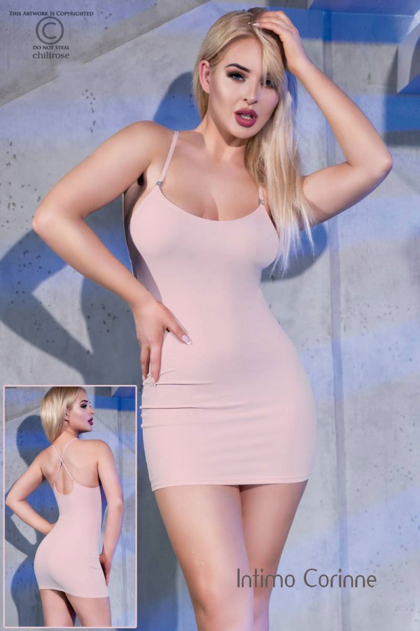 Sexy mini abito elasticizzato in soffice tessuto rosa pallido a costine con spalline regolabili incrociate posteriormente e removibili tramite una grazioso gancetto argentato munito di strass. Include perizoma regolabile sui fianchi con originale taglio posteriore ad Y.