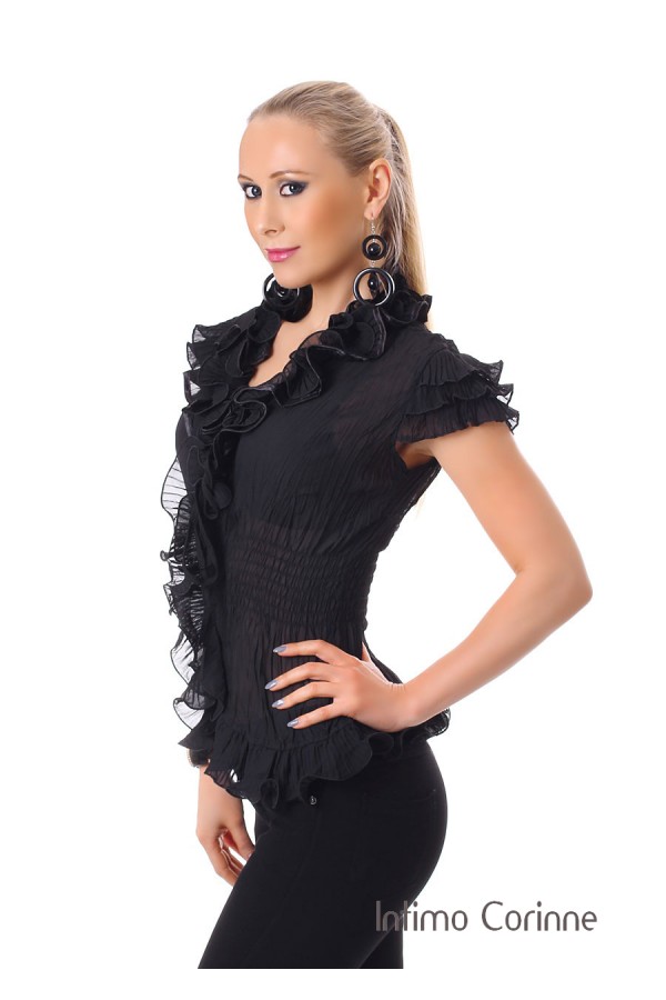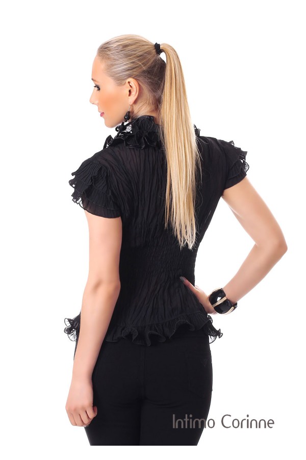 Graziosa camicetta in tessuto arricciato semitrasparente con applicazione di volants rifiniti da un bordino in tessuto satin. Chiusura anteriore tramite bottoni.