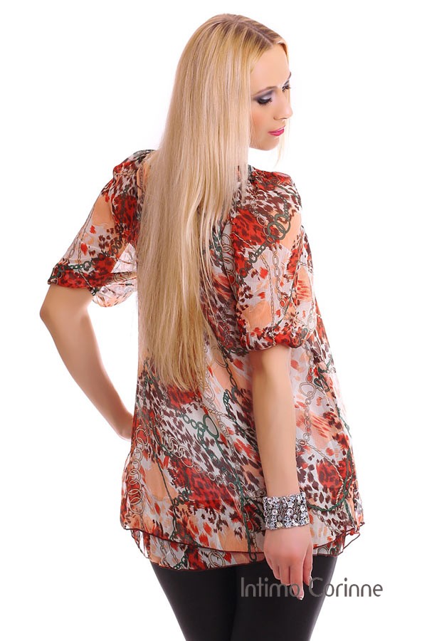 Morbida camiciola svasata a mezze maniche con fiocco frontale in corrispondenza del petto, il tutto abbellito da una graziosa fantasia tendente al rossastro. E' composta da un doppio strato di tessuto, organza fuori e tulle bianco dentro.