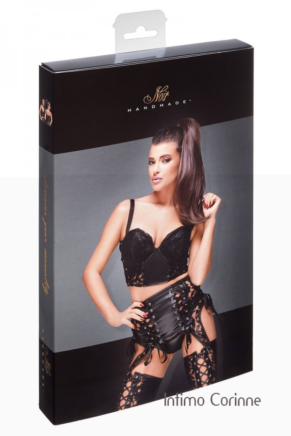Top in pizzo con coppe morbide munite di ferretto, inserti in tessuto coprente semilucido e stringature laterali regolabili. Chiusura sul retro tramite una fila di gancetti.