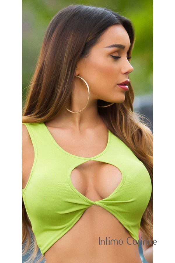 Crop top con sensuale ritaglio tondo all'altezza del seno. Colore verde. Taglia unica one size.