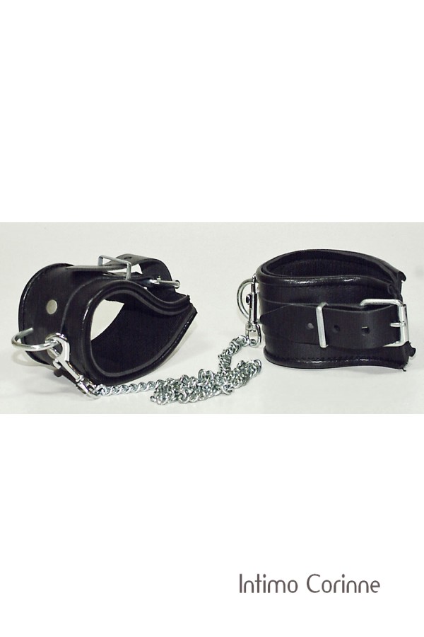 Un accessorio di altissima qualità che stimola la fantasia! Cavigliere regolabili in cuoio nero, larghi circa 6 cm. morbidamente imbottiti all'interno. La catena di circa 50 cm limita i movimenti e può essere rimossa attravero pratici moschettoni.