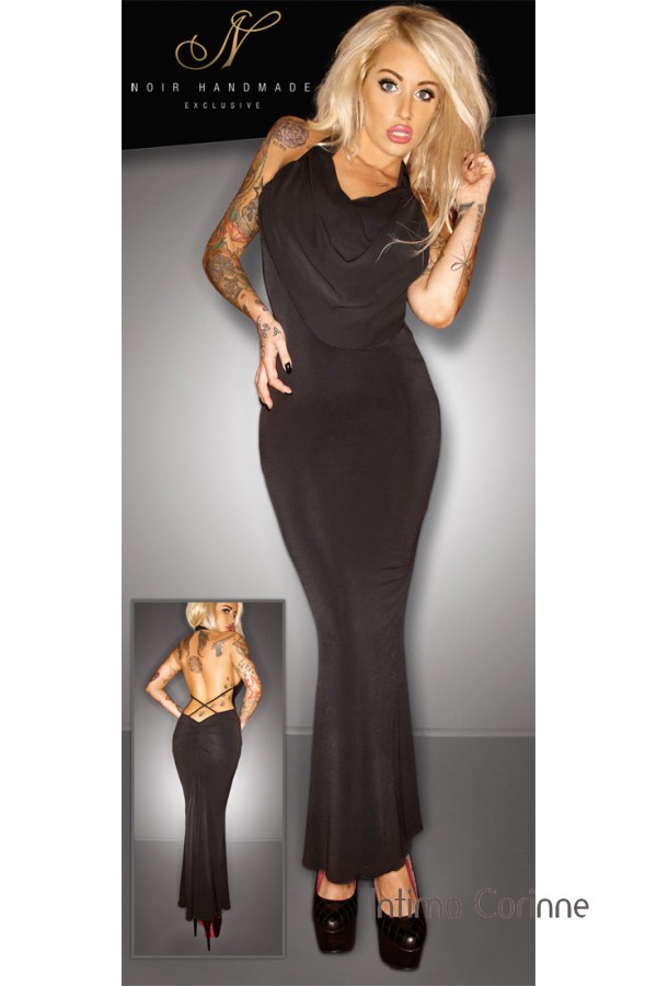 Abito lungo, leggermente svasato, in morbido tessuto nero con sostegno girocollo e chiusura regolabile mediante gancetti. Drappeggio anteriore sul decolletè in tessuto semi trasparente, schiena completamente scoperta con stringhe incrociate nella parte bassa ed arricciature in corrispondenza dei glutei.