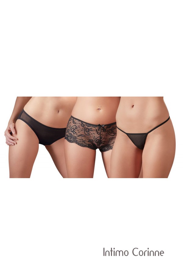 Set tre pezzi composto da una culotte completamente in pizzo mentre perizoma e slip sono realizzati in morbida microrete. Slip completamente aperto dietro.