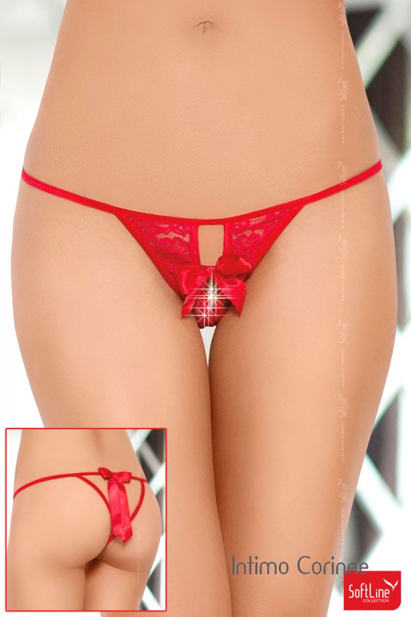 Tanga aperto in pizzo con fiocco in satin cucito davanti e dietro. Aperto al cavallo. Colore bianco.