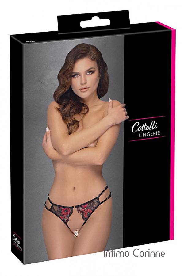 Sensualissimi slip in pizzo floreale bicolore completamente aperti nella zona del cavallo e dei glutei con doppi fianchetti su entrambi i lati che possono essere regolati per una vestibilità perfetta.