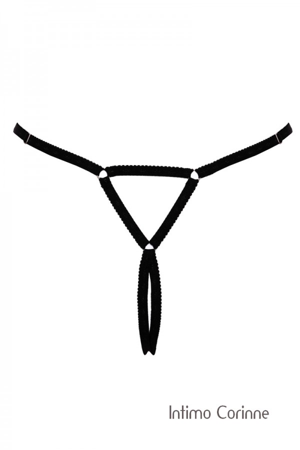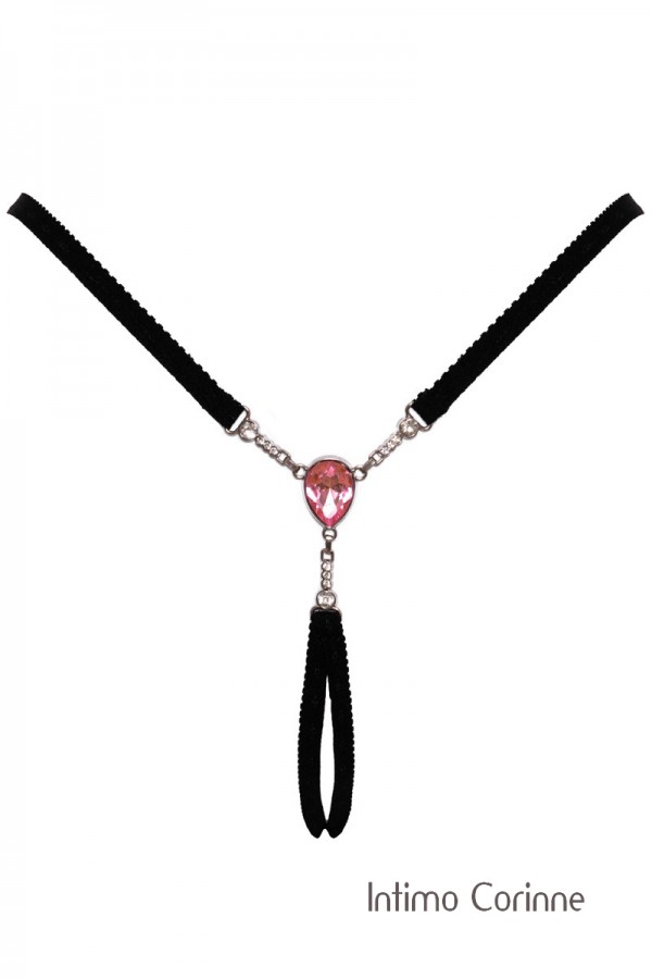 Più un gioiello che un perizoma! Perizoma nero aperto al cavallo, realizzato con cinghie morbide e molto elastiche, con un triangolo aperto sul retro. Davanti è caratterizzato da una grande gemma rosa e una catena argentata con strass incastonati. Fianchetti regolabili per il massimo confort.