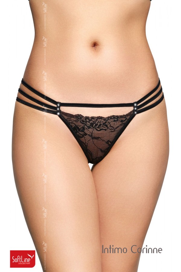 Tanga nero in pizzo floreale con tre fianchetti elastici e strass nella parte anteriore.