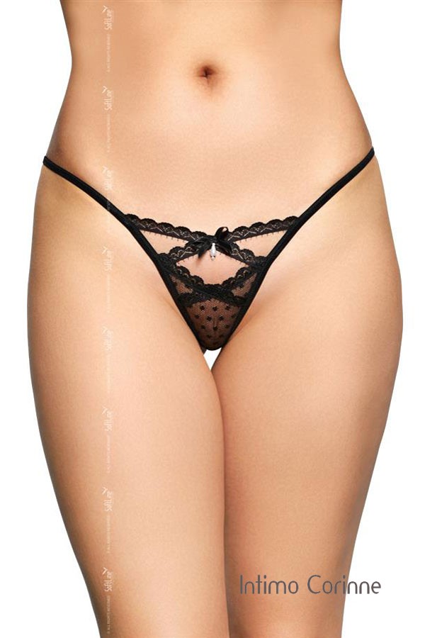 Tanga nero in pizzo a pois con fiocchi e pendenti.