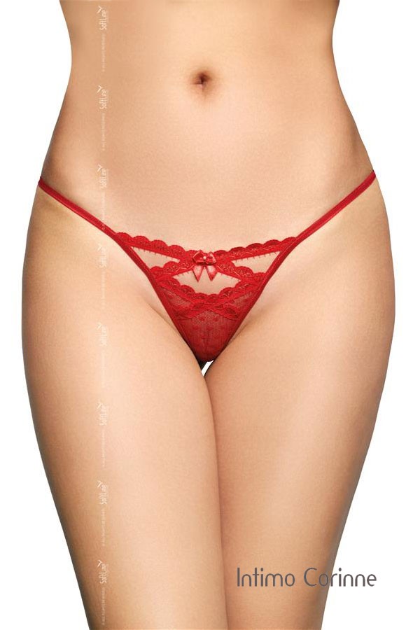 Tanga rosso in pizzo a pois con fiocchi e pendenti.
