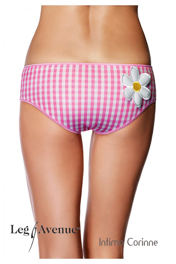 Giovanile slip in cotone a quadrettini con graziosa margherita applicata dietro. Fettucce decorative laterali e fiocchetto centrale davanti.