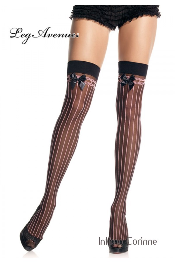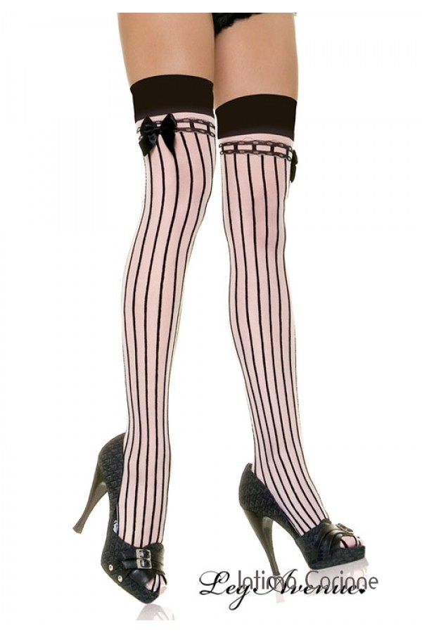 Originalissime calze velate autoreggenti senza silicone con balza e fiocco. Motivo a righe verticali. Disponibile in più colori. Taglia unica O/S.