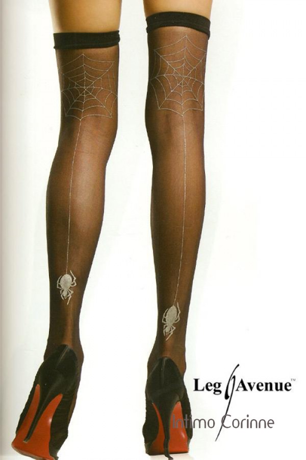 Calze nere velate con balza elastica e disegno posteriore a ragnatela dalla quale si cala un ragno in contrasto bianco.