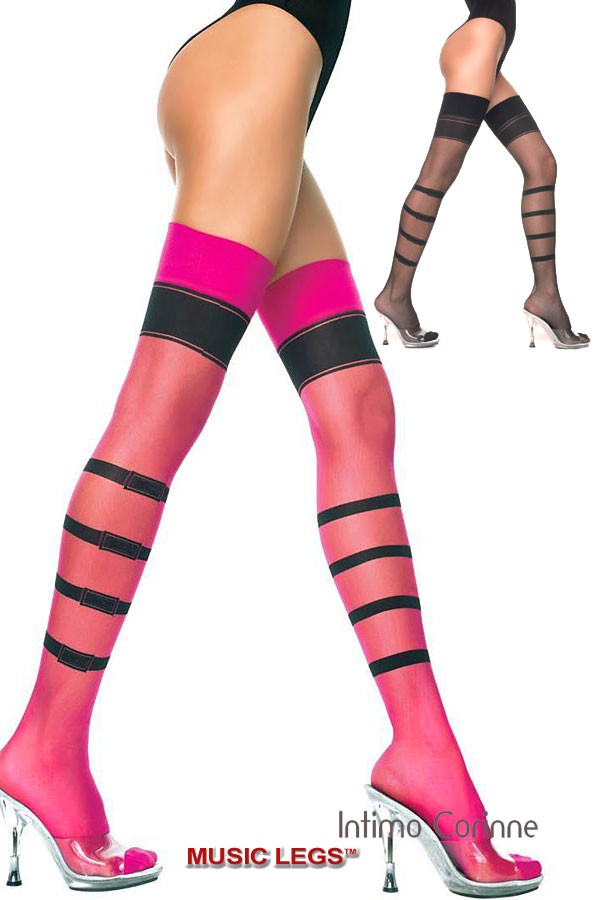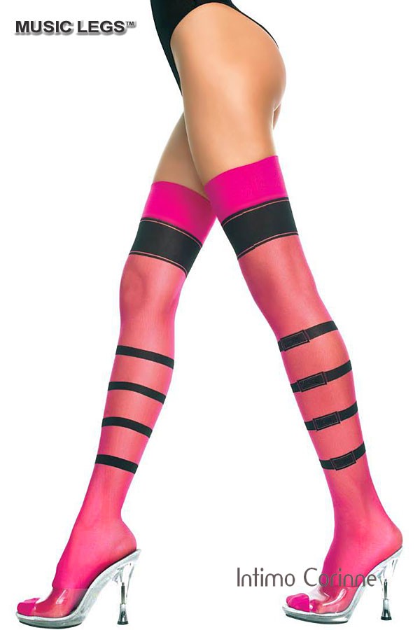 Calze da reggicalze a righe orizzontali coprenti con balza elasticizzata e fibbie disegnate nella parte esterna delle gambe. Punte rinforzate.