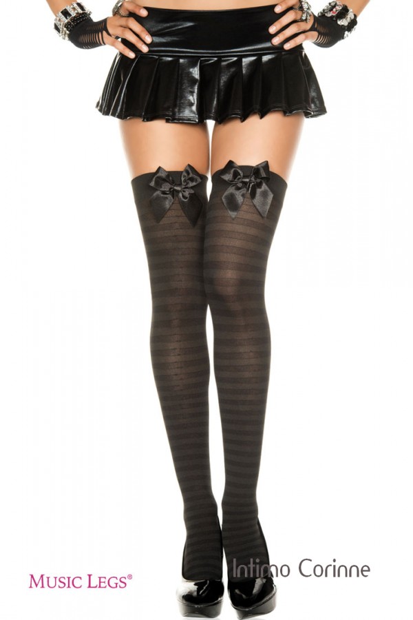 Calze velate con righe orizzontali coprenti e fiocco in raso sulla balza elastica.
