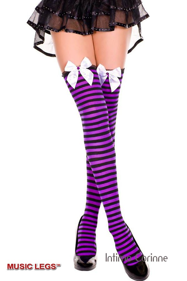 Calze opache viola con sottili righe orizzontali nere e balza elastica arricchita da piccolo merletto nero pieghettato, fiocco in raso bianco e pietra ornamentale al centro.