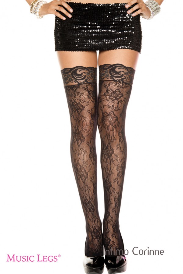 Calze nere da reggicalze in morbido pizzo floreale elasticizzato.