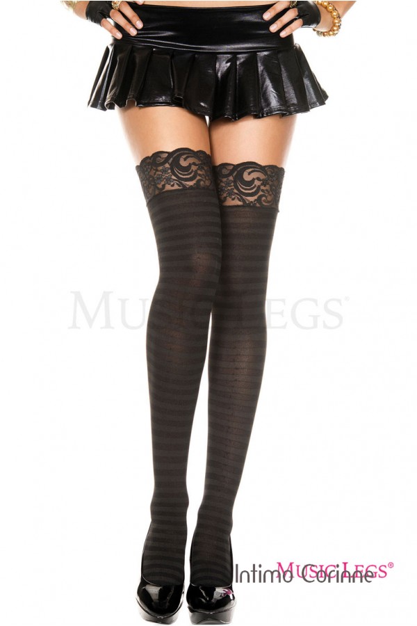 Calze nere a righe orizzontali con balza in pizzo.