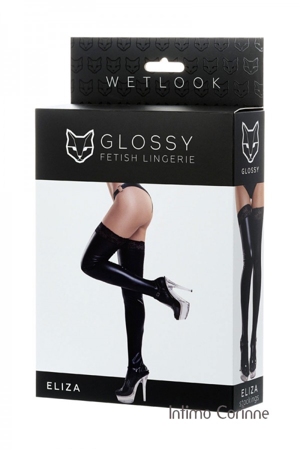 Calze in morbido materiale Wetlook (effetto bagnato) con balza in fine pizzo. Si modella perfettamente alla gamba donando un effetto leggermente brillante. Le calze Wetlook nasconderanno piccoli difetti e renderanno visivamente le gambe più lunghe.