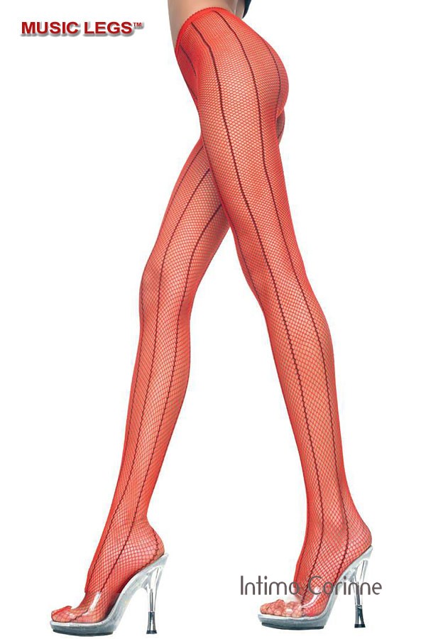 Comodo collant rosso in morbida rete caratterizzata da righe verticali di cucitura a zig zag di colore nero.