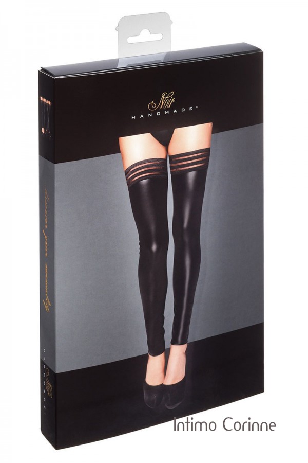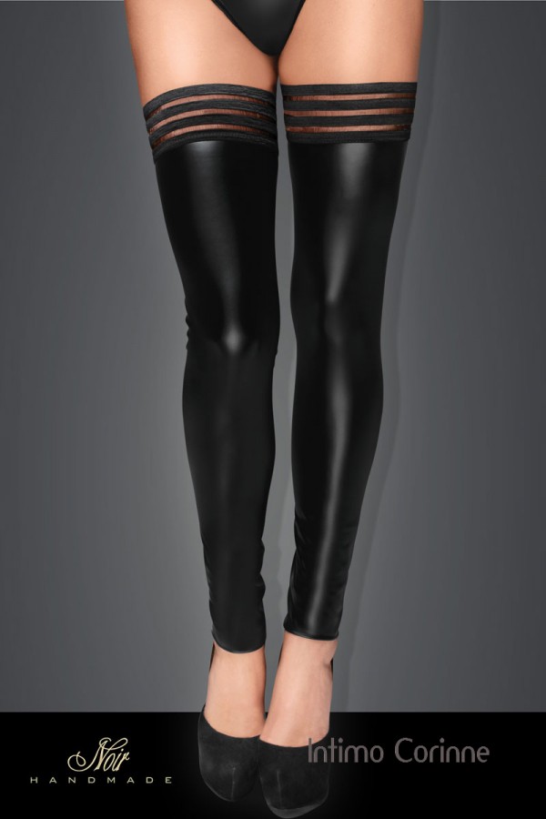 Gambali aderenti in morbido tessuto semilucido con balza elastica a righe.