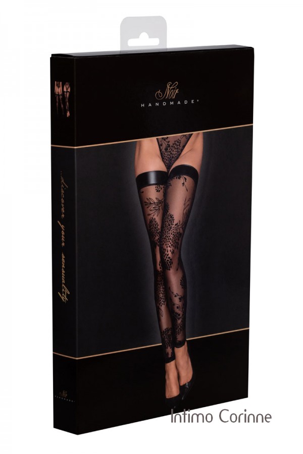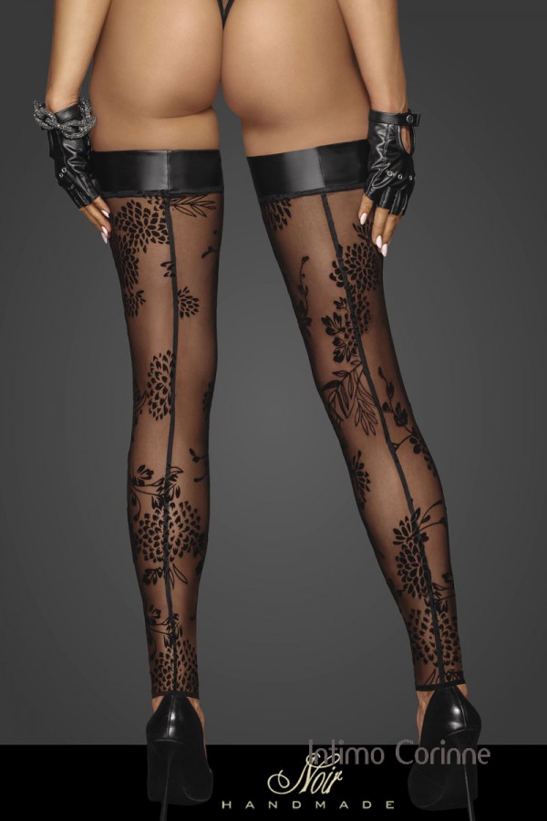 Calze in tulle con ricami floreali floccati e fascia in Powerwetlook.