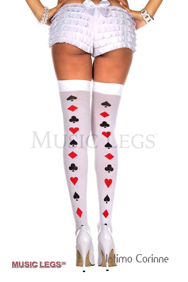 Calze bianche coprenti con disegni raffiguranti i semi delle carte da gioco lungo la parte posteriore. Balza elastica.