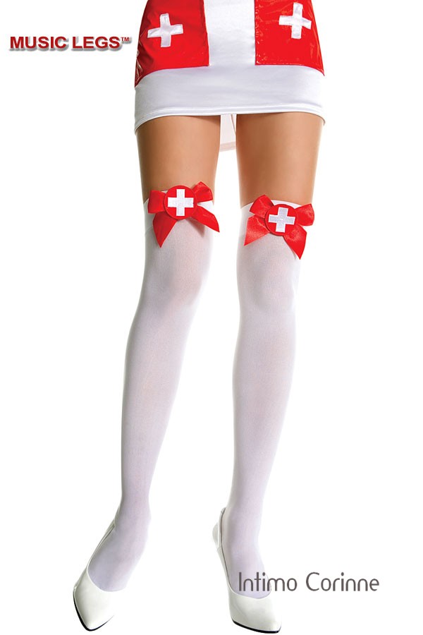 Calze autoreggenti con balza elastica, fiocco rosso in raso e croce bianca. Ideali per travestimenti da infermiera.