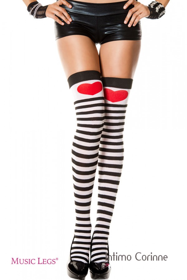 Calze opache bianche/nere a righe orizzontali con cuore rosso disegnato sotto la balza elastica.