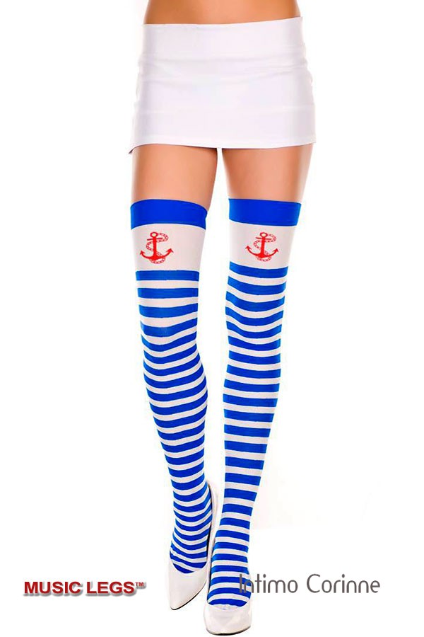 Calze da marinaretta a righe bianche e blu con ancora rossa disegnata sotto la balza elastica.
