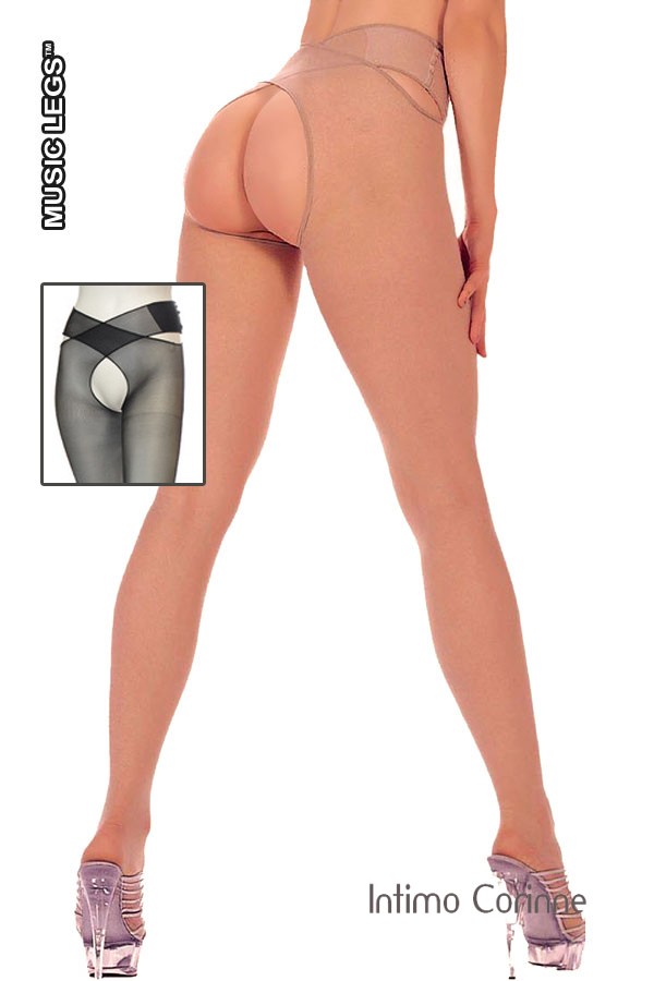 Collant velati con ampia apertura al cavallo e fasce incrociate sul bustino.