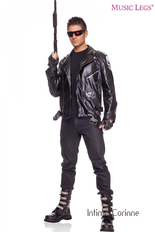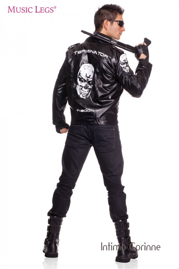 Costume Terminator maschile 3 pezzi. Comprende giacca da motociclista in ottimo tessuto semi lucido effetto pelle con scritte e loghi, cinghia di chiusura lungo il bordo inferiore e cerniera frontale. Include occhiali e guanti corti con borchie. Pantaloni ed altri accessori non inclusi.