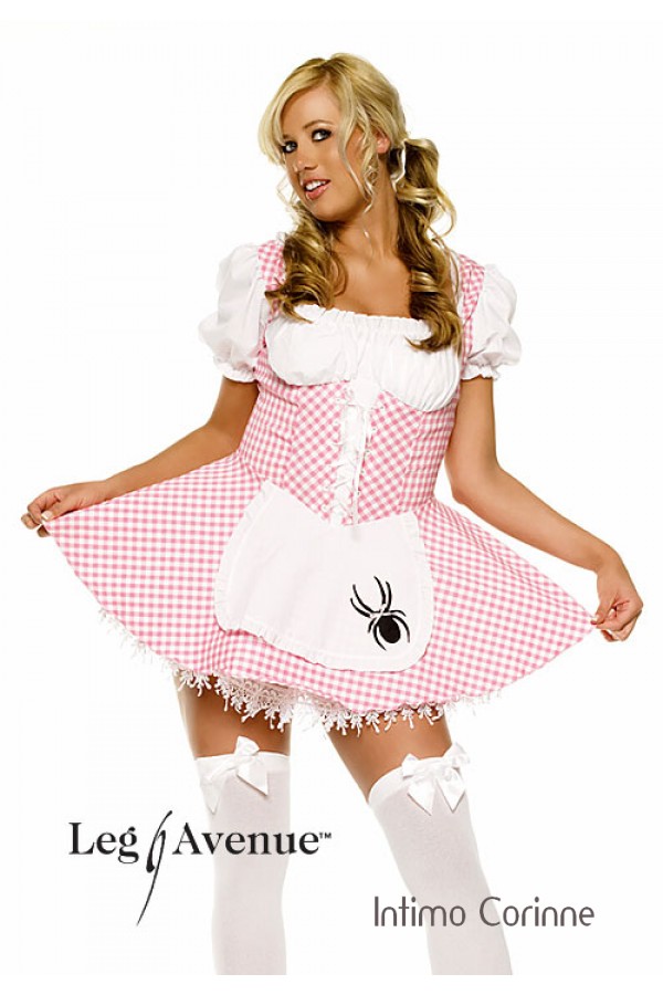 Vestito a quadretti bianco - rosa con top e maniche alla campagnola. Stringatura anteriore, grembiulino con disegno ragno in velluto, cerniera posteriore a scomparsa.