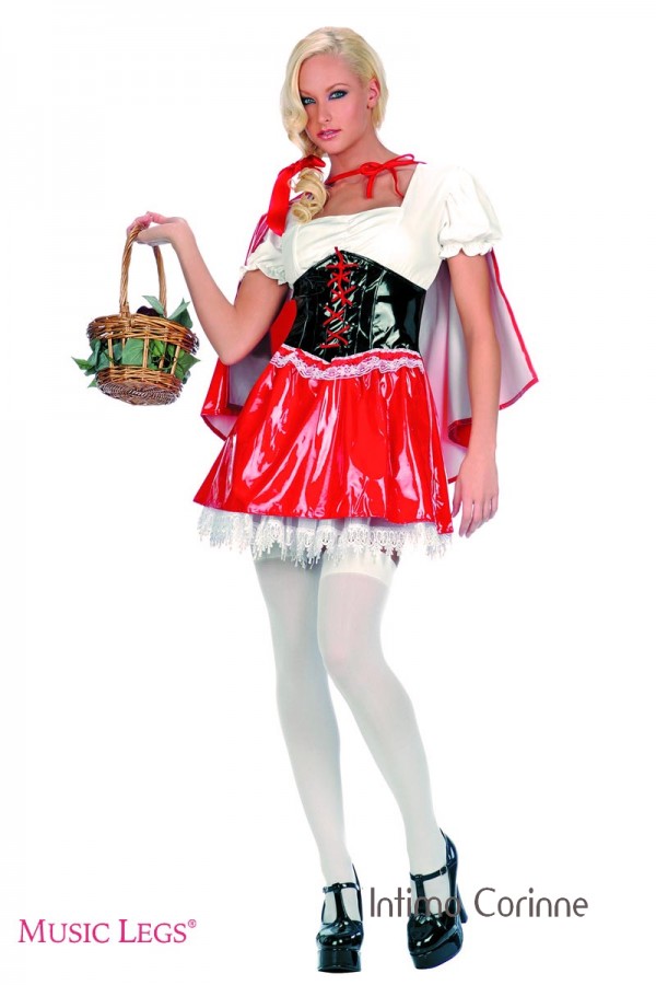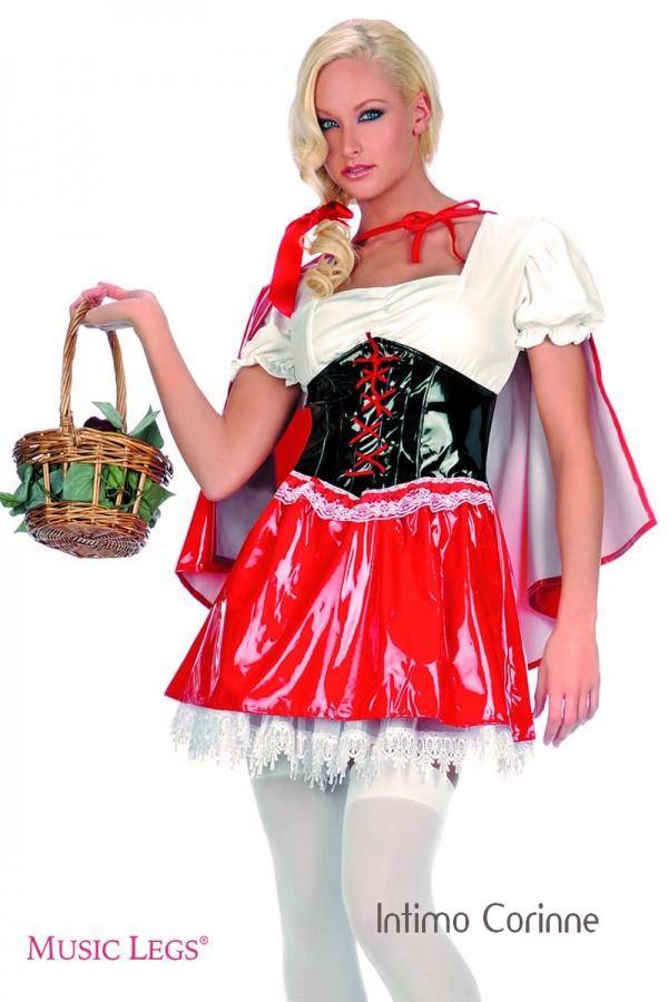 Travestimento Cappuccetto Rosso 2 pezzi composto da miniabito e mantella. Vestito corto scampanato in vinile nero/rosso e parte superiore in tessuto bianco elasticizzato con zip posteriore e stringatura frontale. Mantella rossa in vinile da legare al collo. Sottogonna non incluso.